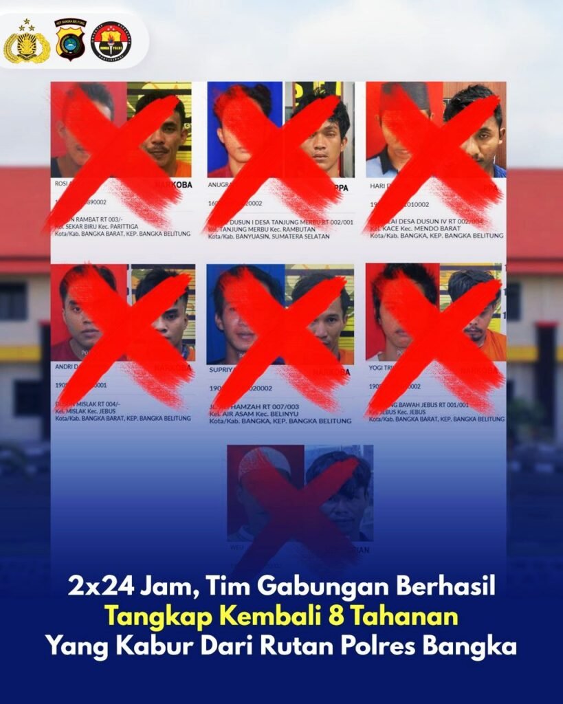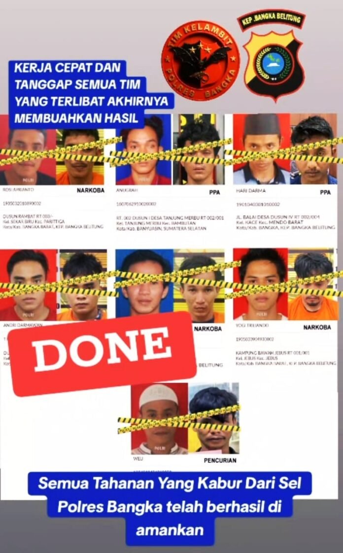 Global Rise TV (Bangka) -Dalam waktu 2×24 jam, tim gabungan berhasil, Menangkap kembali delapan tahanan, yang sebelumnya Melarikan diri dari Rumah tahanan Rutan Polres Bangka,
