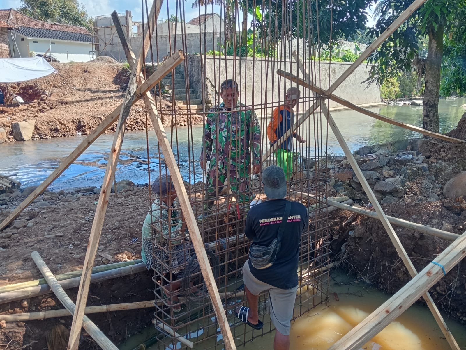 Dengan peralatan sederhana dan kondisi medan yang cukup menantang, pembangunan jembatan terus dikebut. Besi rangka yang mulai berdiri kokoh menjadi saksi kerja keras tanpa pamrih. Tak hanya warga, anggota TNI dari Koramil 0602-13/Padarincang juga turun langsung ke lokasi, menyatu dengan masyarakat, mengangkat, mengikat, dan memastikan setiap bagian jembatan terpasang dengan kuat.