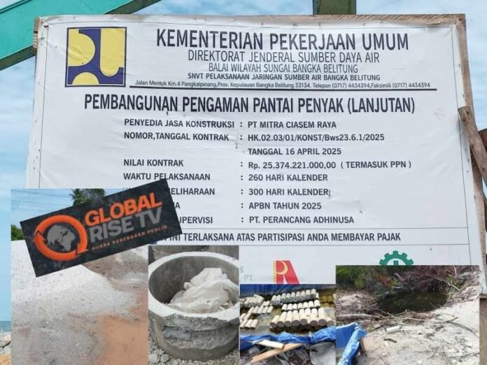 Global Rise TV (Bangka Tengah)-8 November 2025. Proyek pembangunan pengaman pantai di Desa Penyak, Kabupaten Bangka Tengah, kini menjadi sorotan publik. Tim Investigasi GlobalRiseTV menemukan dugaan kuat adanya praktik “proyek siluman” dalam pekerjaan senilai Rp25,37 miliar tersebut, yang didanai dari APBN 2025.