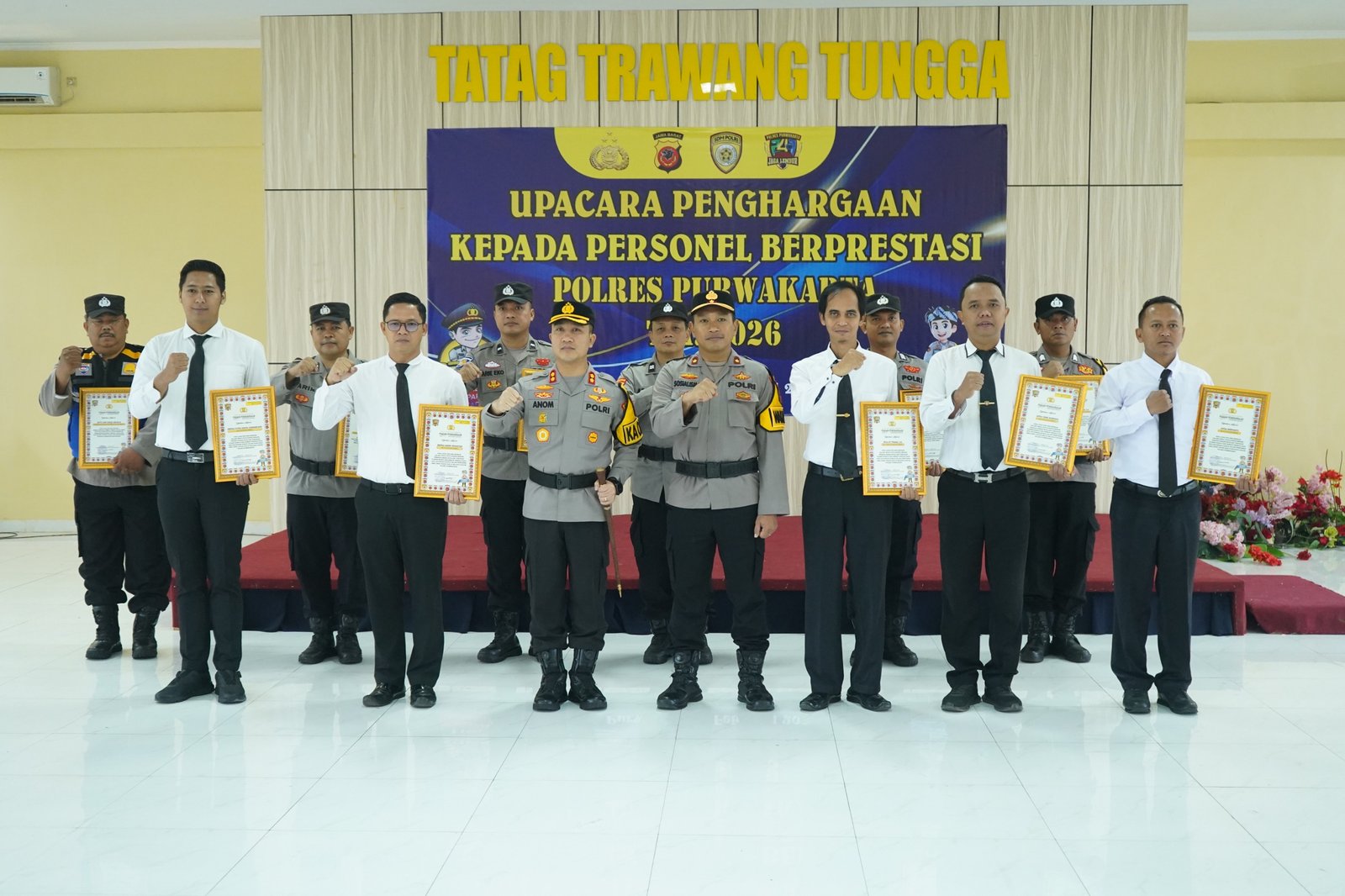Penghargaan diberikan kepada 12 personel Polres Purwakarta atas berbagai capaian dan prestasi, di antaranya keberhasilan penggalangan intelijen dalam menjaga kondusivitas aksi unjuk rasa buruh penetapan UMK/UMSK Tahun 2026, prestasi terbaik tingkat Polda Jawa Barat dalam pelaporan BOS V2 serta inisiasi pembangunan rumah tinggal layak huni dan program kebersihan masyarakat, dedikasi sebagai Danton Dalmas terbaik dalam menghadapi dinamika gangguan kamtibmas, aksi cepat tanggap evakuasi warga yang melahirkan di jalan, capaian nilai IKPA sempurna (100) kategori pagu besar pada Tahun Anggaran 2024, serta prestasi kehumasan melalui konten kamtibmas terbanyak di media sosial dan peran aktif Bhabinkamtibmas Prima Tani Ketahanan Pangan.