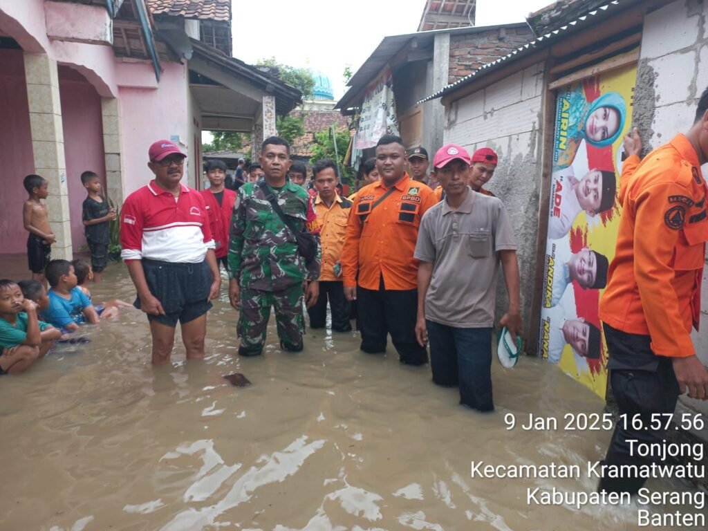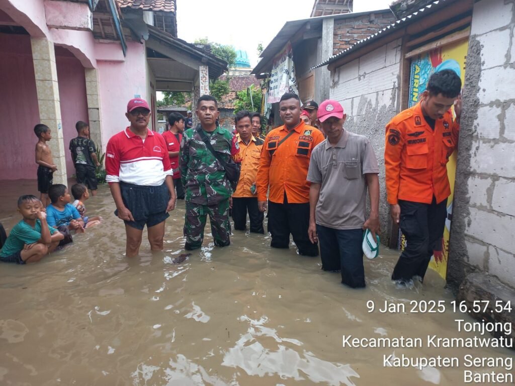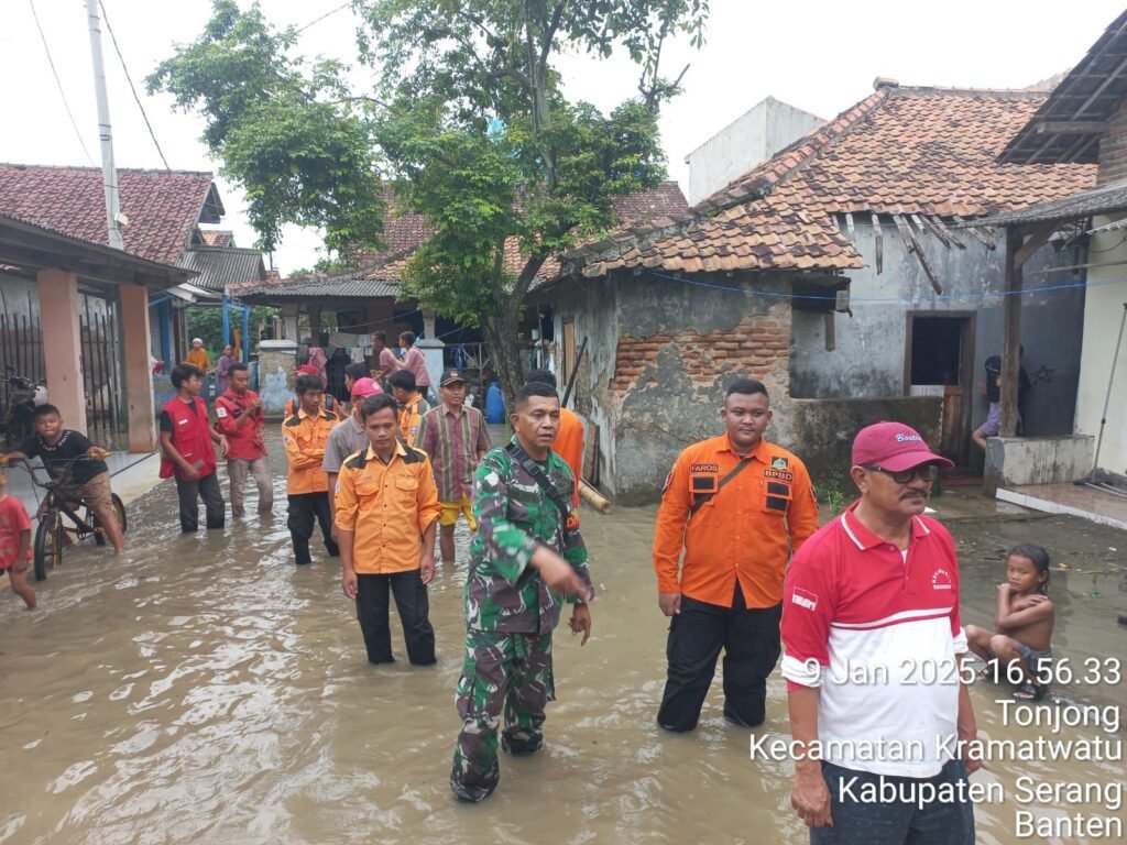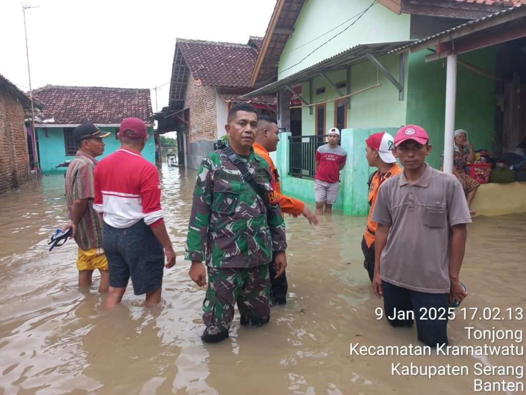 Global Rise TV (Serang)-Serka Yulius, Babinsa Koramil 0602-06/Kramatwatu, melaksanakan kegiatan monitoring di wilayah terdampak banjir di Kampung Tonjong, Desa Tonjong, Kecamatan Kramatwatu, Kabupaten Serang, Provinsi Banten, Kamis (09/01/2025).