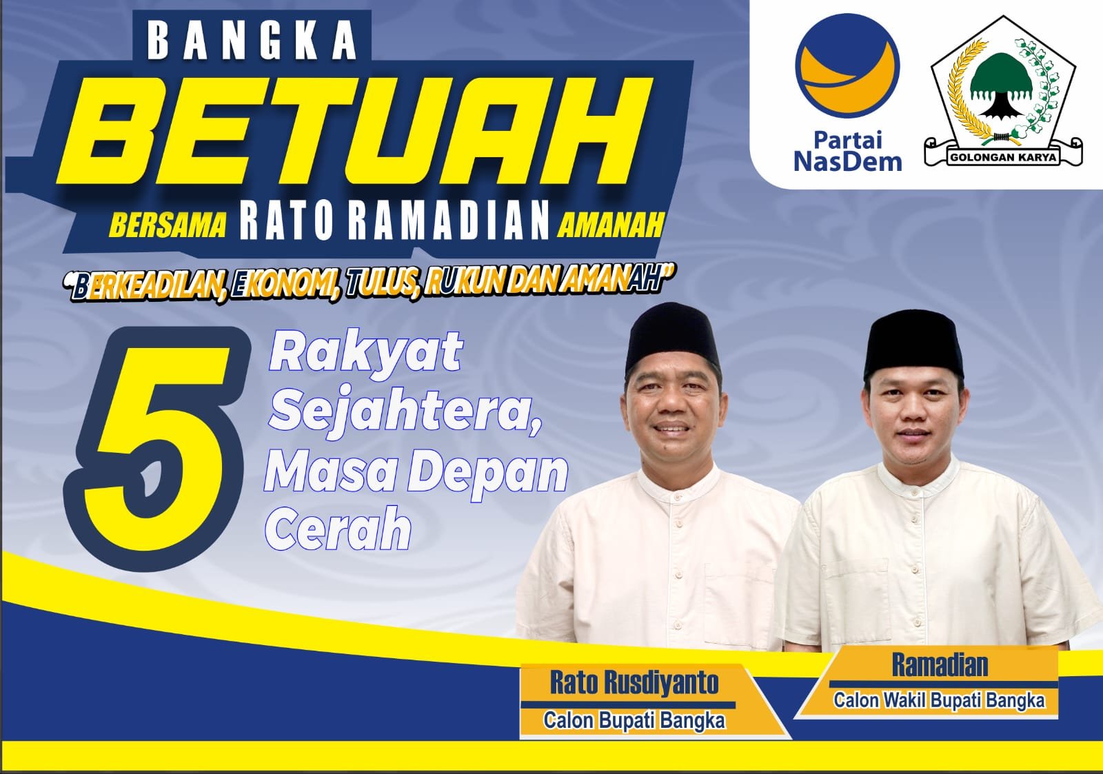 Pasangan yang diusung Partai Nasdem dan Golkar, di Pilkada ulang Bangka, ini menegaskan akan memprioritaskan penguatan ekonomi, rakyat, pengobatan Gratis, peningkatan layanan kesehatan, perbaikan infrastruktur, serta pemerataan pembangunan antara desa dan kota,