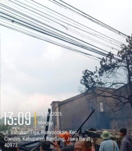 Global Rise TV (Ciwidey,Bandung) – Kebakaran Bengkel Las dan Gudang Rongsokan di jalan Babakan Tiga  Panyocokan, Kecamatan Ciwidey, Kabupaten Bandung,Provinsi Jawa Barat mengakibatkan kabel internet yang menghubungkan ke rumah warga ikut terbakar, Minggu (4/5/2025).