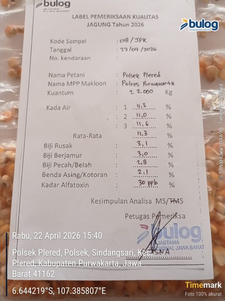 Global Rise TV (Purwakarta) – Polsek Plered, Polres Purwakarta melakukan pengecekan kekeringan kadar air jagung hybrida oleh petugas Bulog di gudang Mapolsek Plered, Pada Kamis, 23 April 2026.