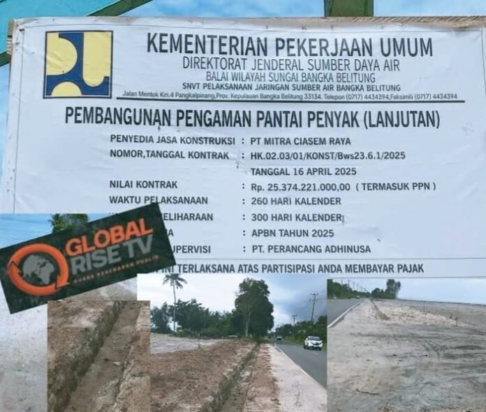 Proyek infrastruktur di kawasan Pantai Penyak, Kabupaten Bangka Tengah, kini berada di titik nadir kepercayaan publik. Investigasi lapangan GlobalRiseTV menemukan indikasi kuat kegagalan kualitas pekerjaan: finishing asal jadi, saluran drainase jalan provinsi ditimbun tanah, pasir timbunan tidak dipadatkan, hingga kendaraan berulang kali kandas. Ironisnya, di balik kerusakan fisik itu, mencuat pula dugaan upah pekerja tidak dibayarkan.