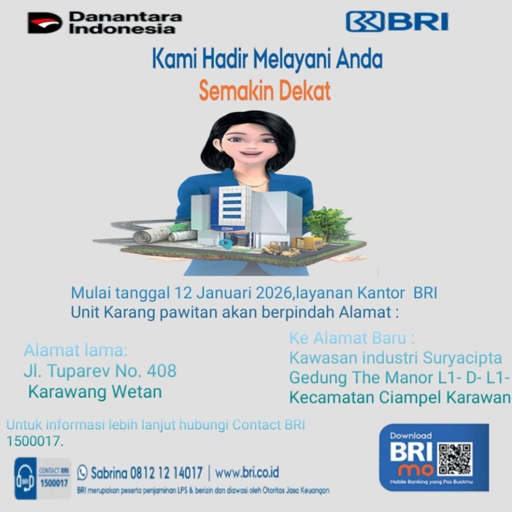 Global Rise TV (Karawang) -Bank Rakyat Indonesia (BRI) Kantor Cabang Pembantu Karawang Wetan mengumumkan relokasi kantor pelayanan mereka mulai 12 Januari 2026, seluruh layanan perbankan BRI Kcp Karawang Wetan akan beroperasi di Kawasan Industri SuryaCipta Gedung The Manor L1-D dan L1-E Kecamatan Ciampel Karawang.