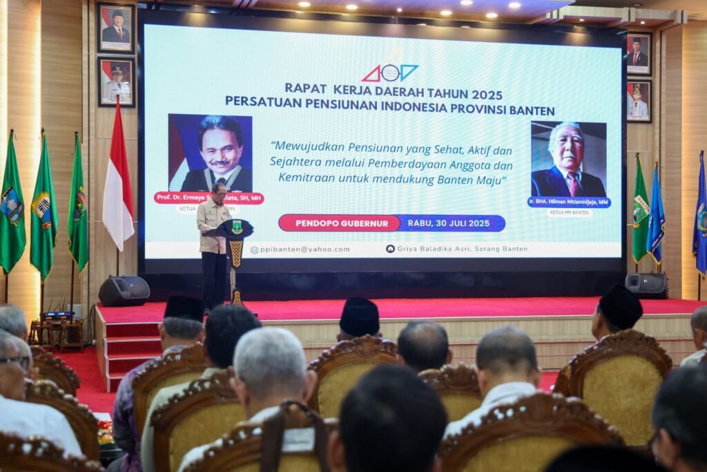 Gubernur Banten Andra Soni diwakili Asisten Daerah Umum Sekretariat Provinsi Banten E A Deni Hermawan membuka Rapat Kerja Daerah (Rakerda) Persatuan Pensiunan Indonesia (PPI) Provinsi Banten Tahun 2025 di Pendopo Gubernur KP3B, Palima Curug Kota Serang, Rabu (30/7/2025). Masa pensiun bukan akhir dari pengabdian, melainkan fase baru untuk tetap aktif dan produktif.