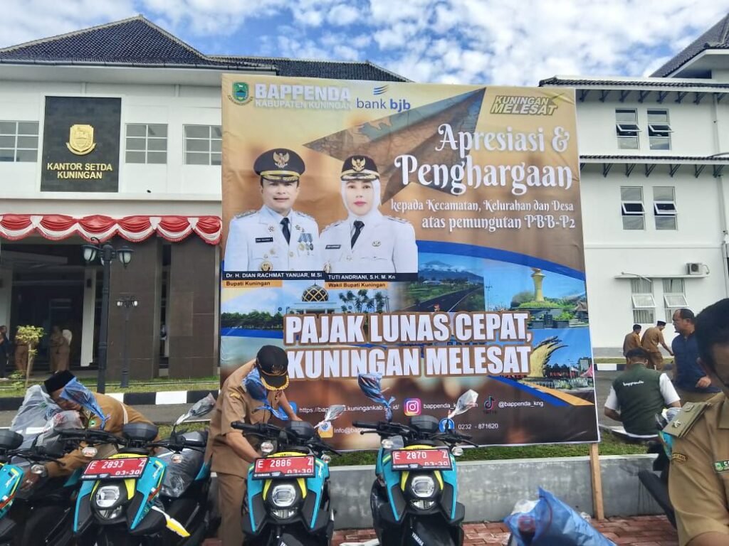 Guruh Irawan Zulkarnaen.S.STP M.Si Kepala Badan Pengelolaan Pendapatan Daerah (Bappenda) Kuningan menyampaikan dari 376 Desa Kuningan , tinggal 42 Desa yang belum menerima penghargaan dalam percepatan pelunasan PBB , mudah mudahan di tahun depan semua desa sudah mendapatkan penghargaan dari percepatan pelunasan PBB , mudah mudahan dari Desa  yang sudah mendapatkan roda dua sebanyak 334 Desa menjadi motivasi bagi yang belum mendapatkan penghargaan kendaraan ,yang penting jangan lelah terus memberikan himbauan dan pemahaman pentingnya bayar pajak .