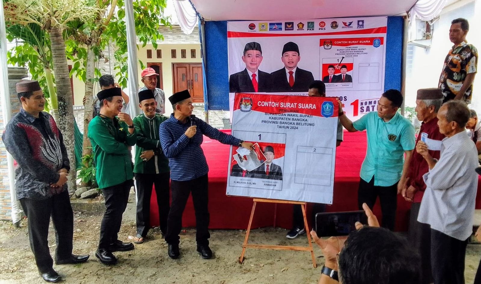 “Kami diberi kepercayaan dan amanah untuk menjadi Bupati dan Wakil Bupati, dari Partai Nasdem, Partai Gerindra, Golkar Bapak Ujang Suprianto, Partai Demokrat, Bapak Sofian, calon Bupati Bangka Bapak Ramadian, dan istri dari Panwascam Sungailiat, (PKD)