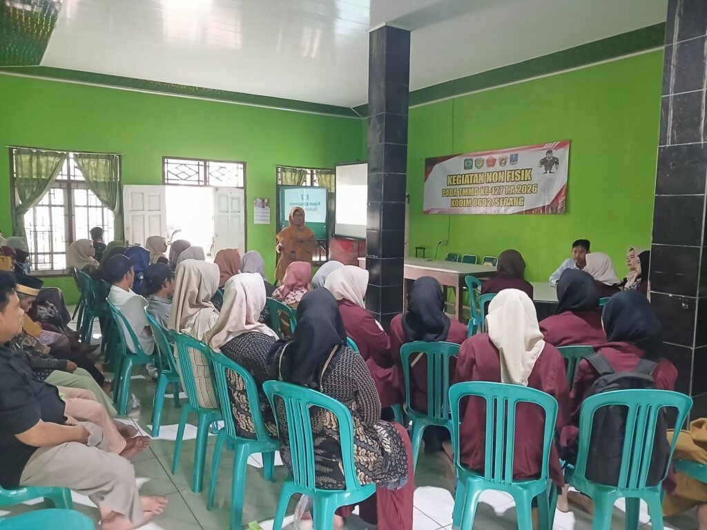 Global Rise TV (Serang) – Satuan Tugas TNI Manunggal Membangun Desa (TMMD) Ke-127 TA 2026 Kodim 0602/Serang menggelar penyuluhan kesehatan bertajuk Pemberdayaan Posyandu dan Posbindu Penyakit Tidak Menular (PTM) di Kantor Desa Sukamenak, Kecamatan Cikeusal, Selasa (24/2/2026).