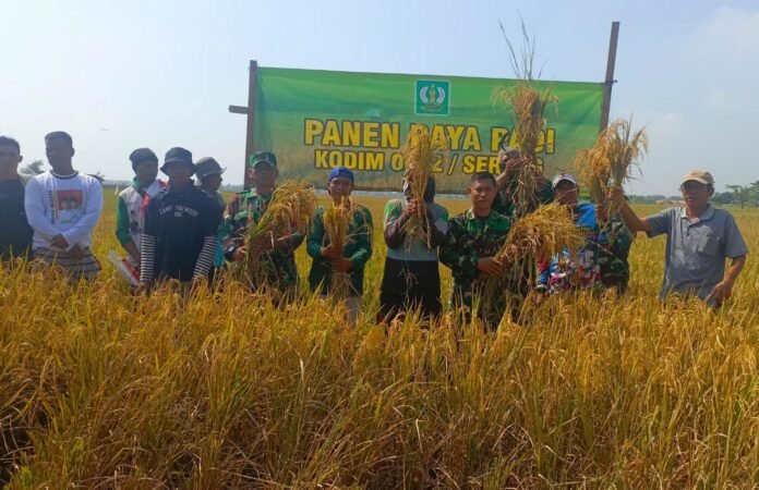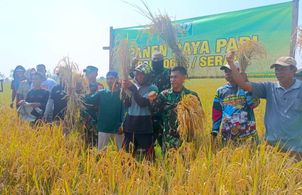 Global Rise TV (Serang) – Komandan Koramil (Danramil) 0602-10/Pontang Kapten Inf Silvanus Elvis mewakili Komandan Kodim (Dandim) 0602/Serang, bersama Babinsa melaksanakan kegiatan panen padi bersama Gabungan Kelompok Tani (Gapoktan) Ratu Tani, bertempat Kegiatan ini berlangsung di Desa Kebon Ratu, Kecamatan Lebakwangi, Kabupaten Serang, Provinsi Banten, Rabu (30/07/2025).
