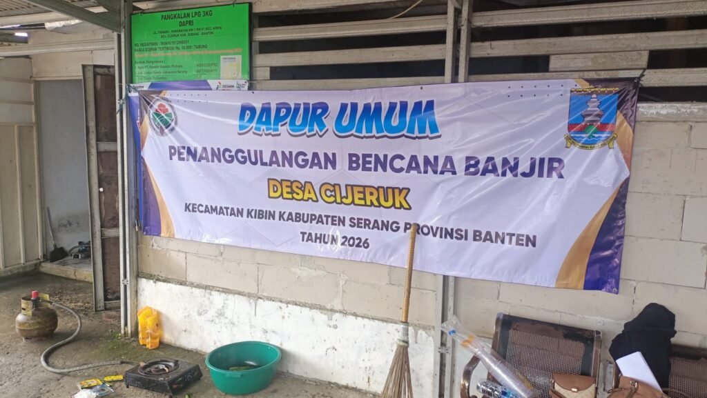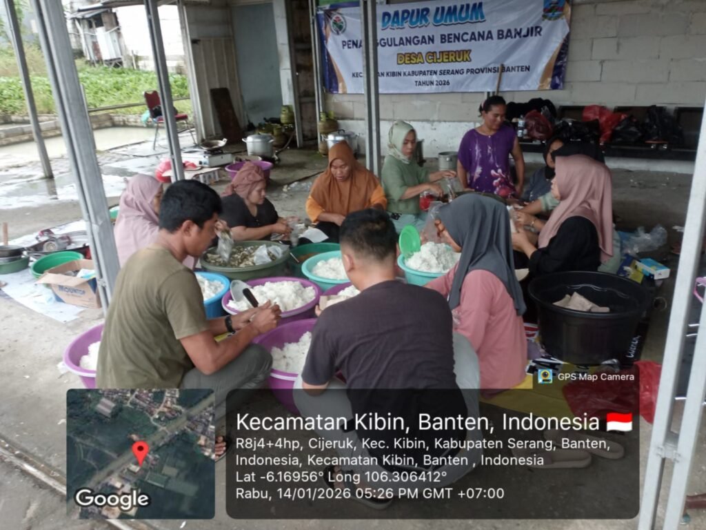 Global Rise TV,(Serang)– Pemerintah Desa Cijeruk, Kecamatan Kibin, Kabupaten Serang, Provinsi Banten, mendirikan dapur umum sebagai bentuk penanggulangan bencana banjir yang melanda wilayah tersebut pada awal tahun 2026. Langkah ini dilakukan untuk membantu memenuhi kebutuhan konsumsi warga yang terdampak banjir. Jumat, (16/1/26).