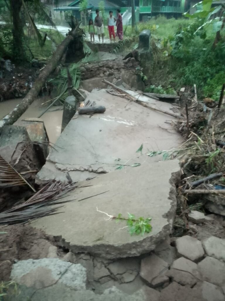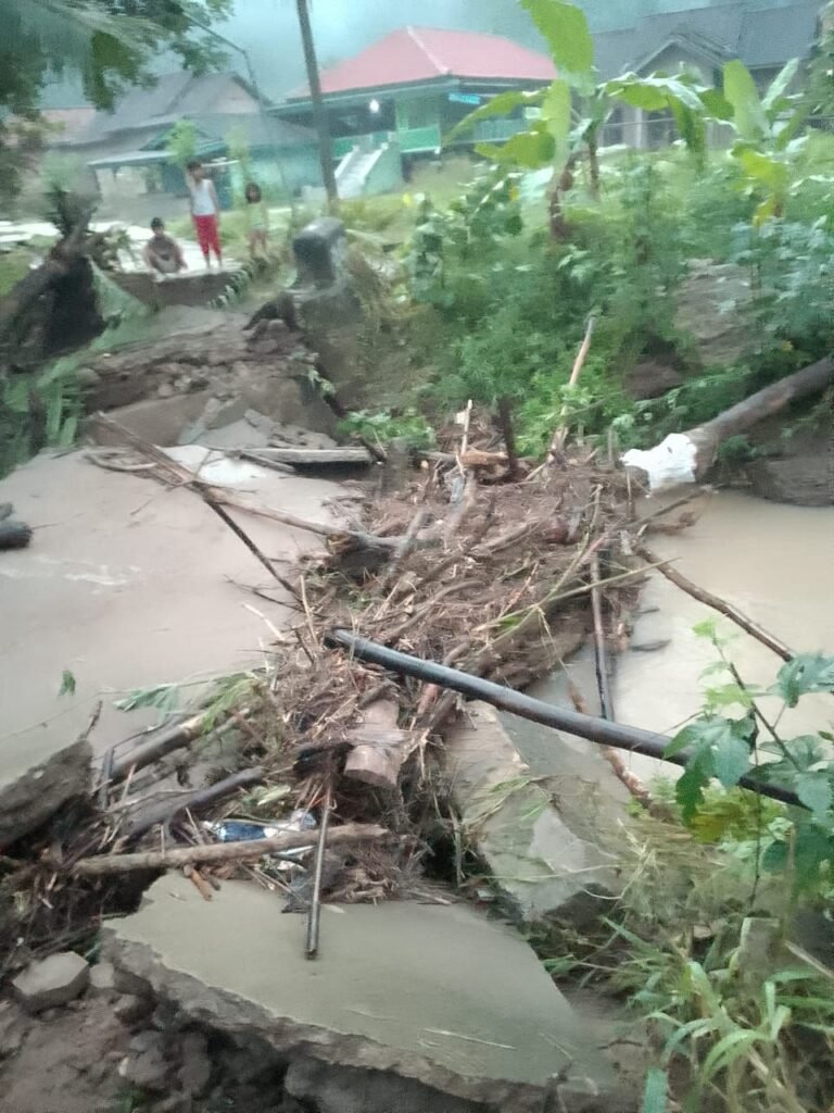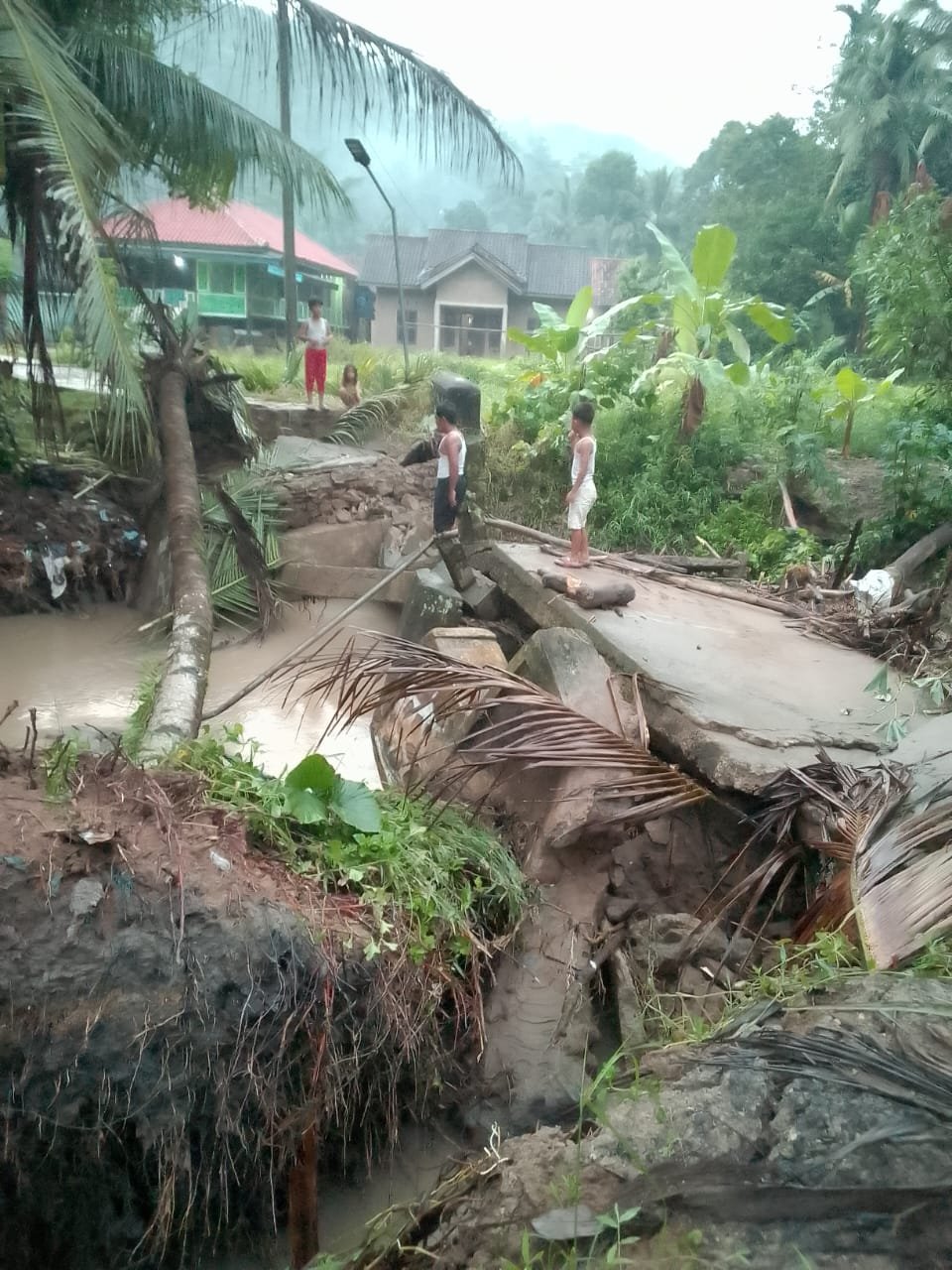 Selain jembatan yang terputus dan banyak pohon kelapa yang tumbang banjir besar pun melanda hingga warga sulit untuk menjalani aktifitas sehari-hari.