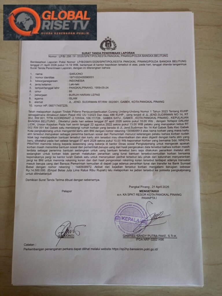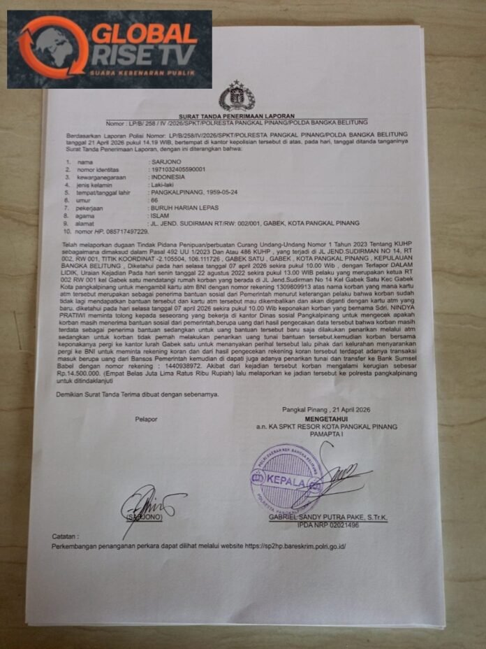 Global Rise TV (Pangkalpinang), 29 April 2026 — Dugaan penggelapan dana bantuan sosial (bansos) Kartu Keluarga Sejahtera (KKS) kembali mencuat dan menyita perhatian publik di Kota Pangkalpinang. Kasus ini menyeret nama Siska, Ketua RT 02 Kelurahan Gabek Satu, yang kini resmi dilaporkan ke pihak kepolisian.