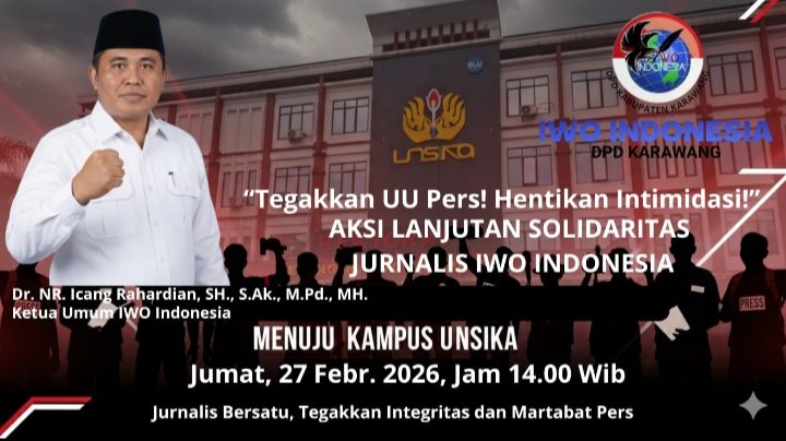 Global Rise TV (JAKARTA) – Dewan Pimpinan Pusat (DPP) Ikatan Wartawan Online Indonesia (IWOI) resmi mengeluarkan instruksi kepada seluruh jajaran pengurus dan anggota di Indonesia untuk menggelar Aksi Nasional Bela Jurnalis di depan Kampus Universitas Singaperbangsa Karawang (UNSIKA), Jumat, 27 Februari 2026 pukul 14.00 WIB hingga selesai.