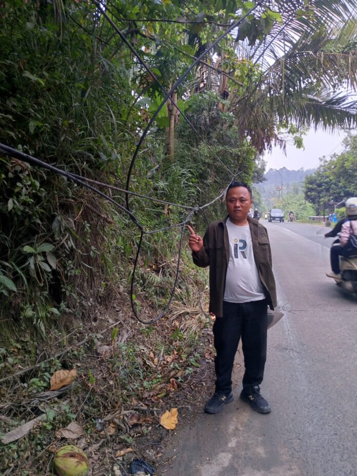 Global Rise TV (Serang) -, 28-04-2026,Kabel jaringan telekomunikasi yang diduga milik salah satu penyedia layanan, termasuk Telkom, terlihat berserakan di jalan raya Palka tepatnya di lokasi kp.Ciwadas Desa Pancanegara Kecamatan Pabuaran.