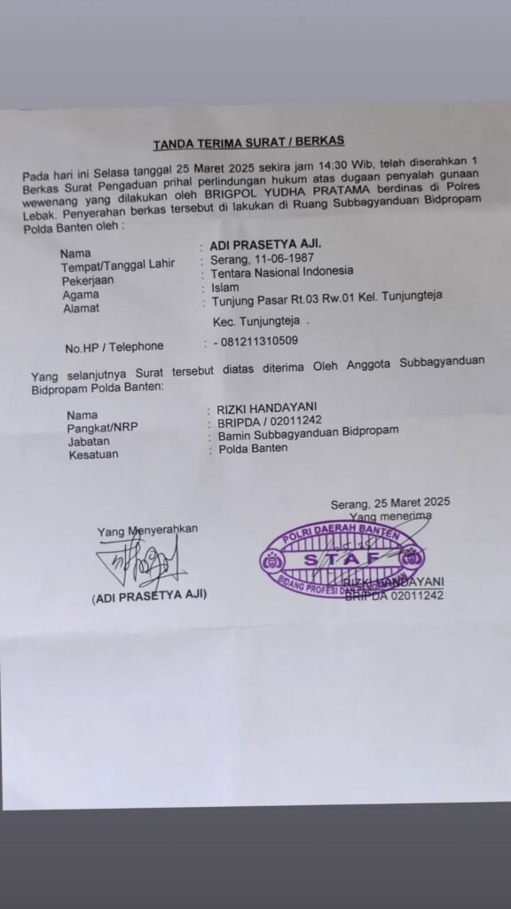 Global Rise TV  (SERANG) – Seorang warga Pamarayan, Kabupaten Serang, Adi Prasetya Aji yang berprofesi sebagai Anggota TNI, resmi melaporkan dugaan penculikan dan penyalahgunaan wewenang yang diduga dilakukan oleh Brigpol YP, Anggota Polres Lebak. Laporan tersebut berkaitan dengan penangkapan adiknya yang bernama AFR alias Alul yang dinilai tidak sesuai prosedur.