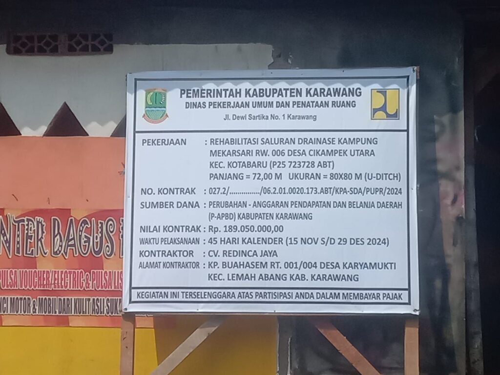 Pekerjaan proyek pembangunan rehabilitasi saluran drainase tersebut dari Dinas Pekerjaan Umum dan Penataan Ruang (PUPR) Karawang.