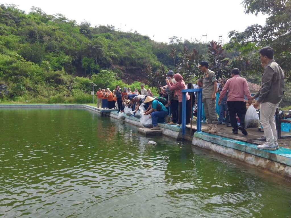 Gebyar Pasukan Paus di Embung Nanjung Desa Cisantana Kecamatan Cigugur Kuningan di tebar. Kepala Dinas Perikanan dan Peternakan Kabupaten Kuningan Wawan Setiawan .S.HUt MT