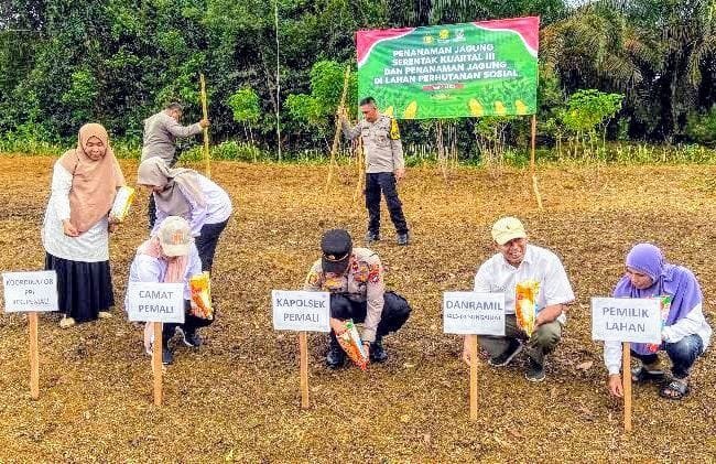 Global Rise TV (Bangka Sungailiat)-Polsek Pemali terus menunjukkan Komitmennya dalam mendukung program ketahanan pangan Nasional bersama warga desa penyamun, Kecamatan Pemali Kabupaten Bangka, Kapolsek Pemali Ipda Tri Nurhadi, melaksanakan penanaman jagung serentak di lahan Binaan Polri, Rabu (09/07/2025)