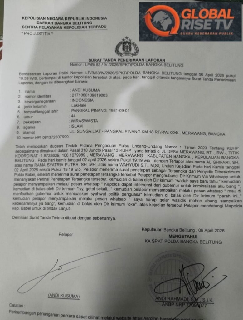 Global Rise TV (Bangka Belitung)— Selasa 07/04/2026. Dr. Andi Kusuma, SH, secara resmi melaporkan Kepala Kepolisian Daerah (Kapolda) Kepulauan Bangka Belitung, Irjen Pol. Victor Sihombing, ke Mabes Polri pada Selasa dini hari (7/4/2026) tepat pukul 00.00 WIB. Laporan tersebut juga turut menyeret jajaran Direktorat Reserse Kriminal Umum (Dirkrimum) Polda Babel, Kombes Pol M. Rivai Arvan yang disebut dari tingkat atas hingga bawah.