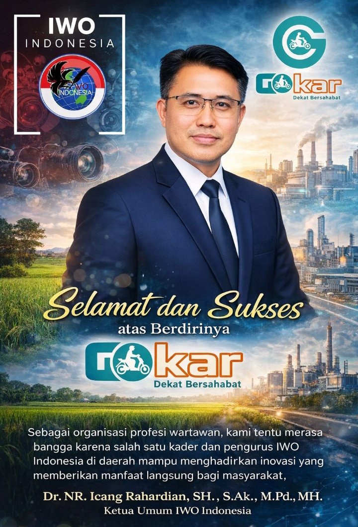 Global Rise TV (KARAWANG)– Ketua Umum Ikatan Wartawan Online Indonesia (IWO Indonesia), Dr. NR. Icang Rahardian, menyampaikan apresiasi atas berdirinya perusahaan aplikasi transportasi online lokal GOKAR (Go Karawang). Inovasi digital tersebut dinilai sebagai langkah positif dalam mendukung perkembangan ekonomi daerah sekaligus membuka peluang kerja bagi masyarakat.