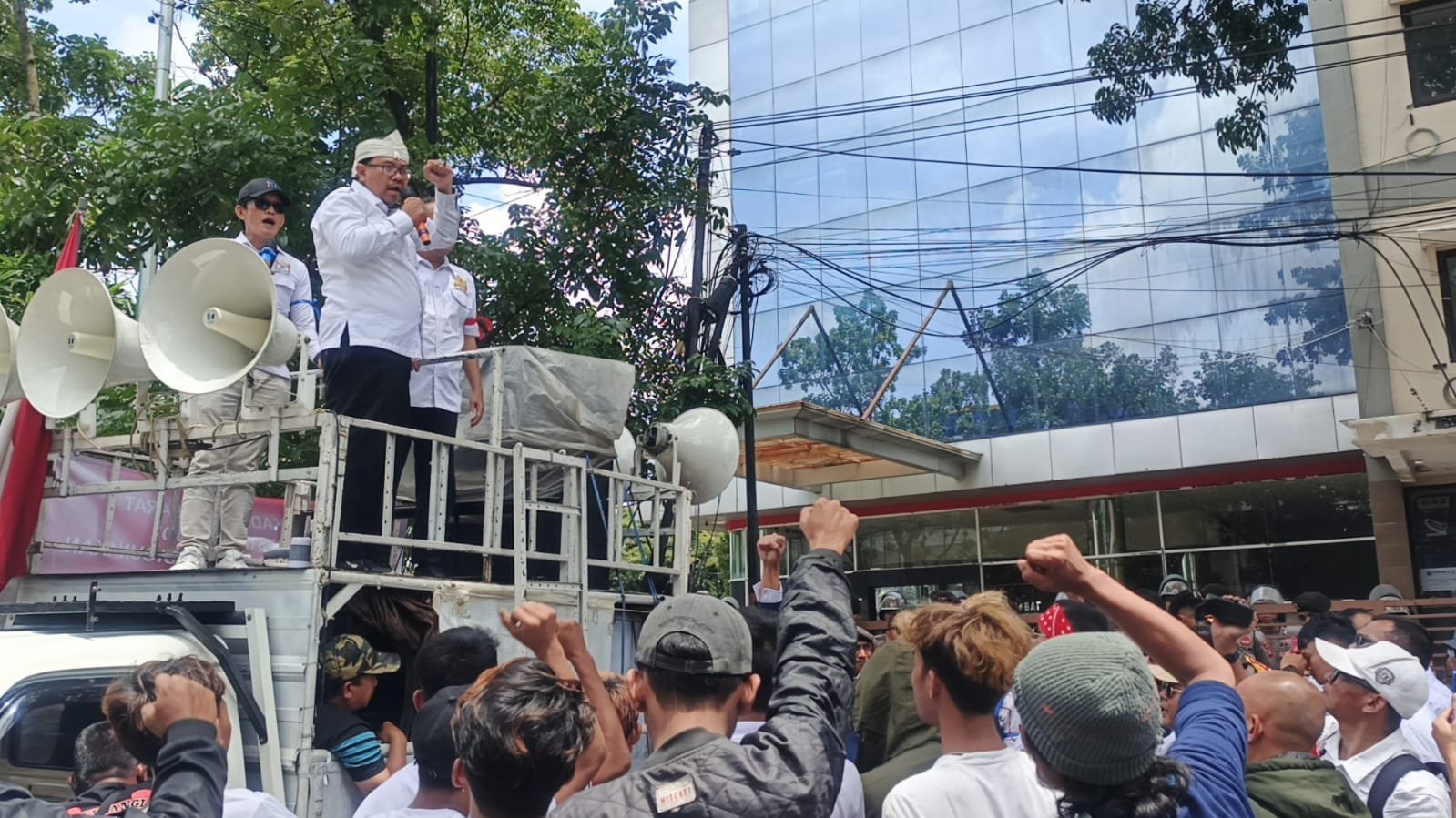 Aksi massa berlangsung dengan orasi terbuka, pemasangan spanduk bertuliskan “GEDUNG KADIN JAWA BARAT DALAM STATUS QUO”, serta poster “BANGUNAN INI DISEGEL”. Polisi melakukan pengamanan ketat, sementara akses Jalan Sukabumi sempat ditutup ketika penyegelan dilakukan.