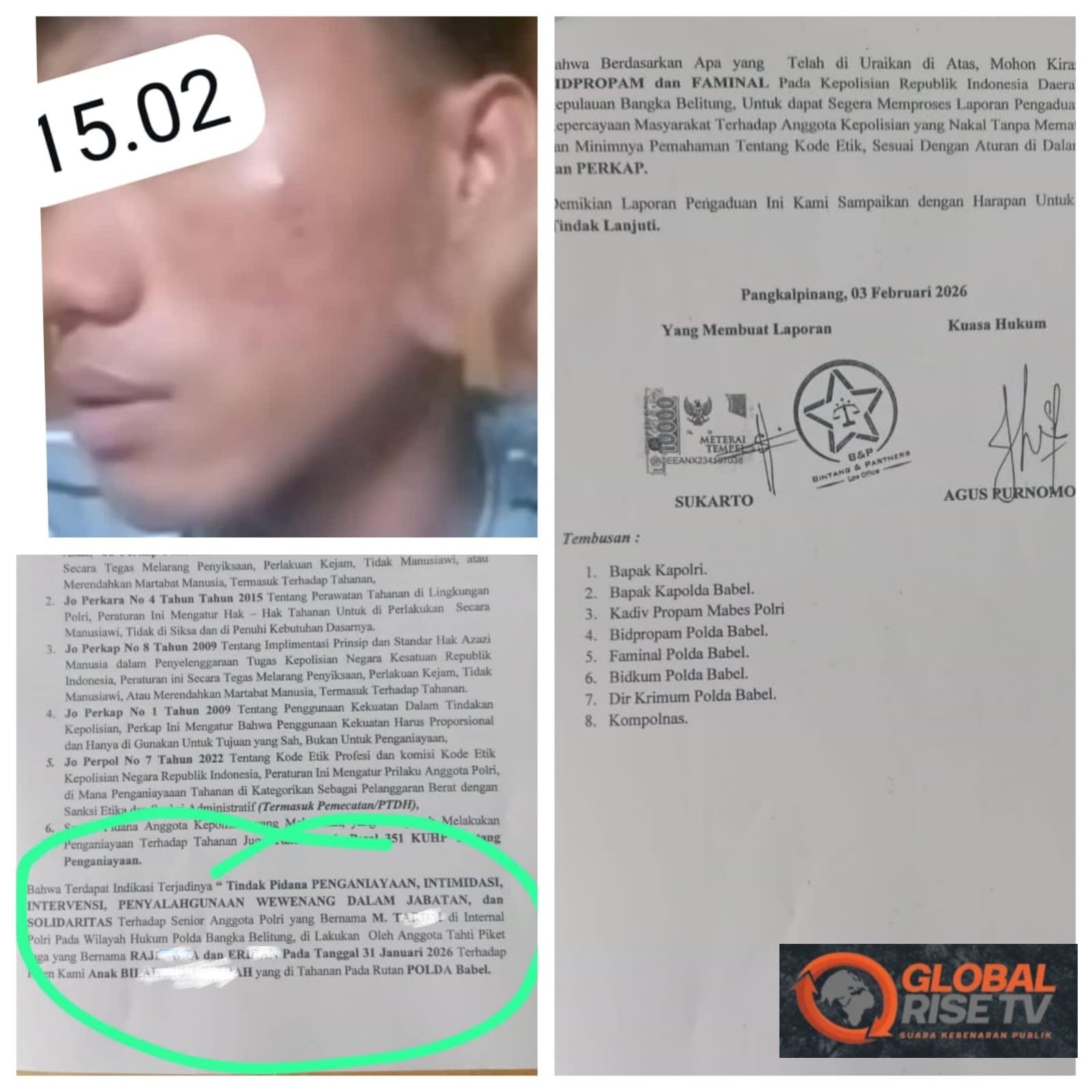 Laporan tersebut diajukan melalui kuasa hukum Law Office Bintang & Partners kepada Bidpropam dan Paminal Polda Babel, serta ditembuskan ke sejumlah pejabat tinggi kepolisian dan lembaga pengawas eksternal.