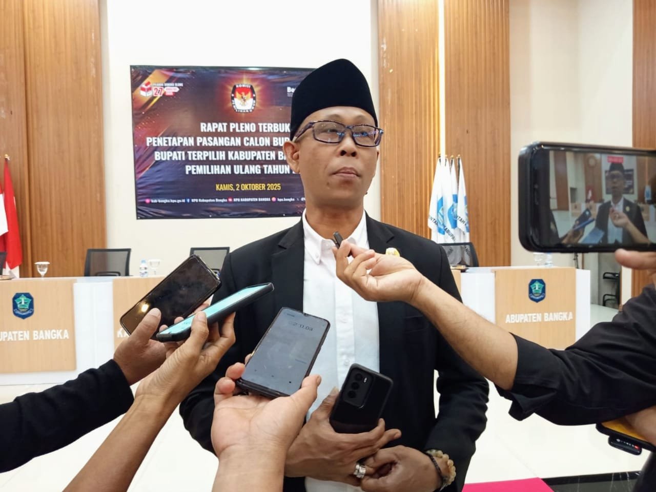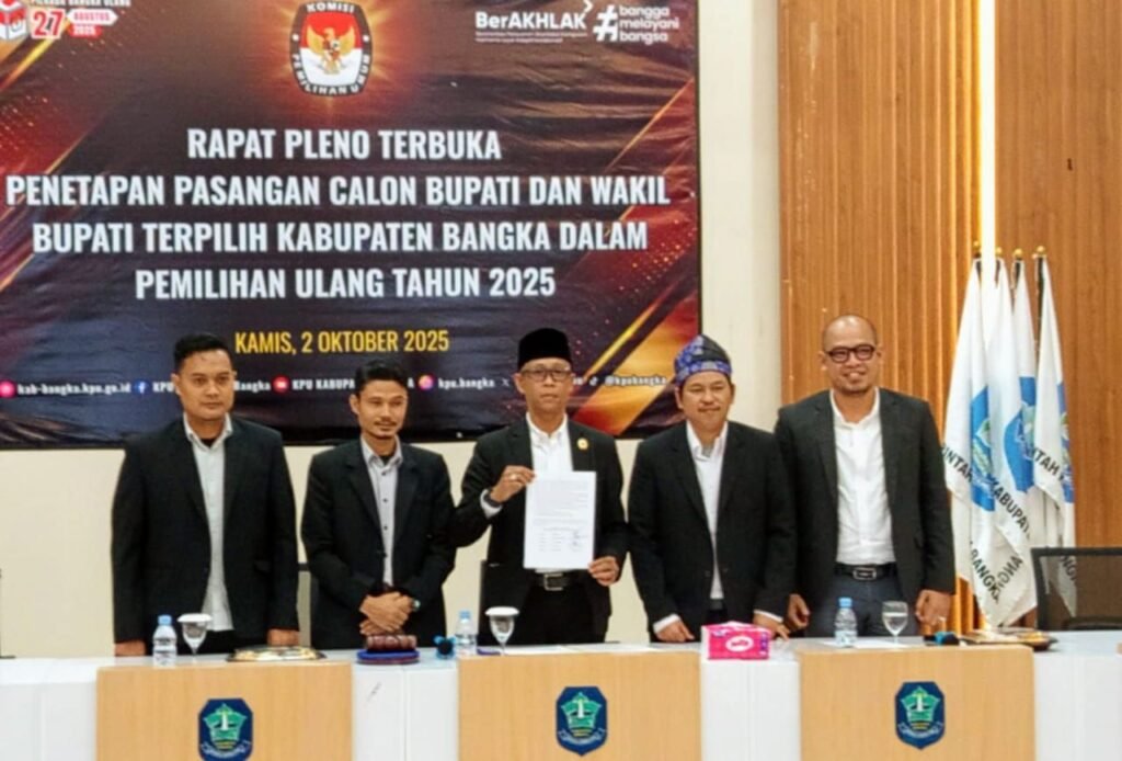 Karena itu KPU Kabupaten Bangka, melaksanakan penetapan calon Bupati dan Wakil Bupati Bangka, terpilih dalam Pilkada ulang Kabupaten Bangka, tahun 2025 yakni pasangan No. Urut (1) Fery Insani, dan Syahbudin, sebagai Bupati dan Wakil Bupati Bangka terpilih dalam Pilkada, Bangka, ulang tahun 2025. dalam Pilkada, ulang Bangka 2025 ini, pasangan Fery-Syahbudin, memperoleh suara terbanyak, yakni sebanyak 48.806 dari total suara Sah, ucap”, Sinarto, Pungkasnya (Imron)