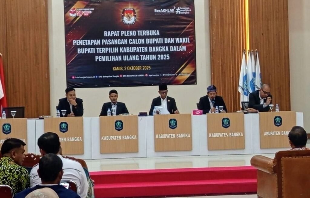 Membaca Berita Acara No. 202/702.7-A/1901/2025 tentang penetapan calon Bupati dan wakil bupati terpilih Kabupaten Bangka, dalam pemilihan ulang tahun 2025, pada hari kini Kamis tanggal (2) Oktober tahun 2025, tempat di Gedung Graha Maras Kantor Bupati Bangka, Sungailiat,