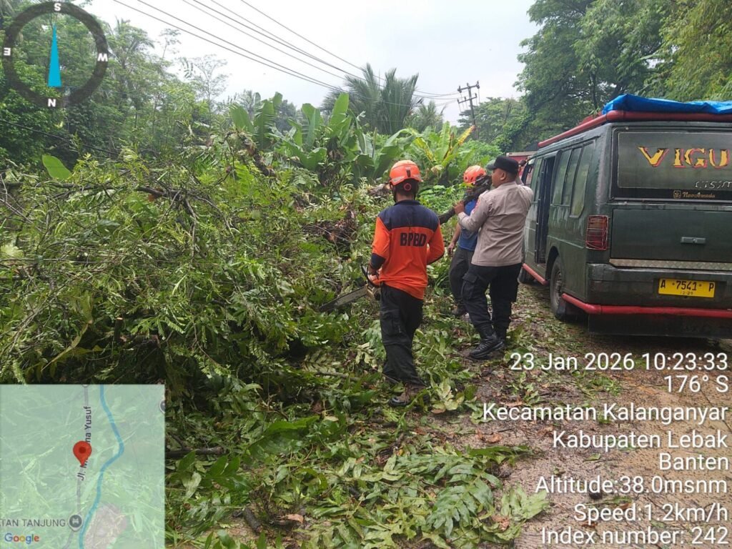 Dan BPBD Kabupaten Lebak bergerak cepat mengevakuasi pohon tumbang yang melintang di ruas jalan Rangkasbitung- Leuwidamar,di Kampung Ranca Lutung,Desa Kalanganyar, Kecamatan Kalanganyar, Kabupaten Lebak.
