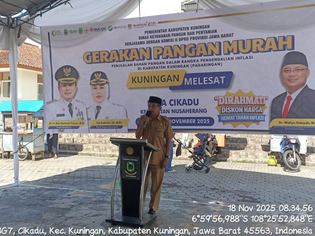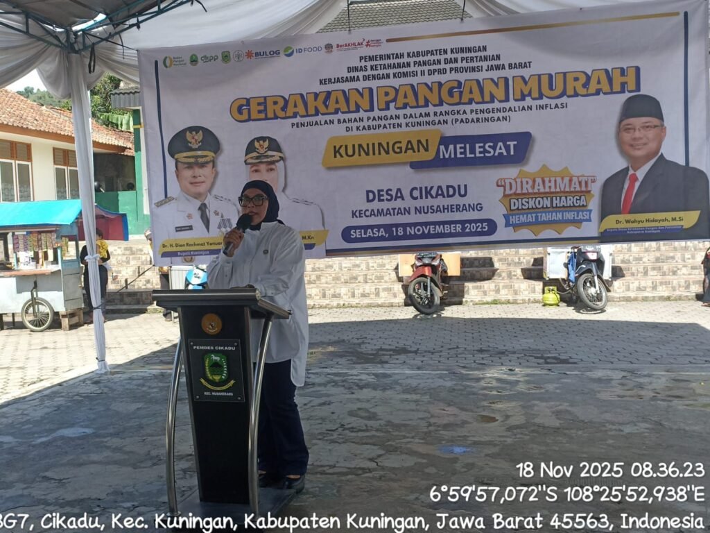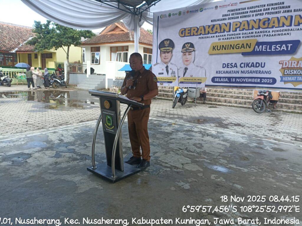 Kabid .Penyedia dan Distribusi Pangan Ating Setiawan . SE rneyampaikan Alhamdulillah pada hari ini Selasa 18 Nopember 2025 Gerakan Pangan Murah yang ke.66 yang dilaksanakan di Desa Cikadu Kecamatan nusahetang Kuningan , dan dihadiri Anggota DPRD Provinsi Hj.Ila Rahmatika.SE . Ating Setiawan menyampaikan permohonan maaf seyogyanya Bapak Bupati dan Ibu Wakil Bupati mau hadir namun karna ada kegiatan yang tidak bisa diwakilnya dengan tidak mengurangi acara gerakan pangan murah hari ini , saya ditugaskan untuk mewakilinya Kadis Ketahanan Pangan dan pertanian Kuningan . Kabid.Ating Setiawan , mengucapkan terima kasih pula atas kehadiran Hj.Ika Rahmatika.SE Anggota DPRD Provinsi Jabar yang hadir dalam kegiatan GPM hari ini yang di selenggarakan di Desa Cikadu Kecamatan Nusaherang ,semoga kegiatan ini dapat membantu masyarakat yang membutuhkan juga dalam upaya menekan Inflasi , dalam menekan harga kebutuhan pokok. Ating Setiawan kegiatan ini merupakan kegiatan yang berkelanjutan dalam upaya membantu masyarakat dalam memenuhi kebutuhan bahan pokok bagi masyarakat . Ating pemerintah Kabupaten Kuningan melalui Dinas Ketahanan PNgan dan pertanian memiliki.nenetapa kegiatan yakni Gerakan Pangan Murah sebagai upaya pengendalian ketika akan terjadi atau pada saat setelah terjadinya gejolak pasokan dan harga pangan , Fasilitas Distribusi Pangan. Kegiatan pemantauan , pengumpulan dan pengolahan serta analisis data serta informasi harga pangan untuk di informasikan ke publik. Pungkas Ating Setiawan.SP