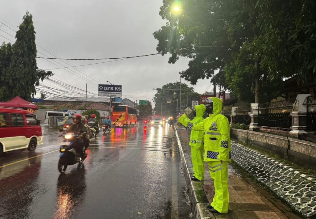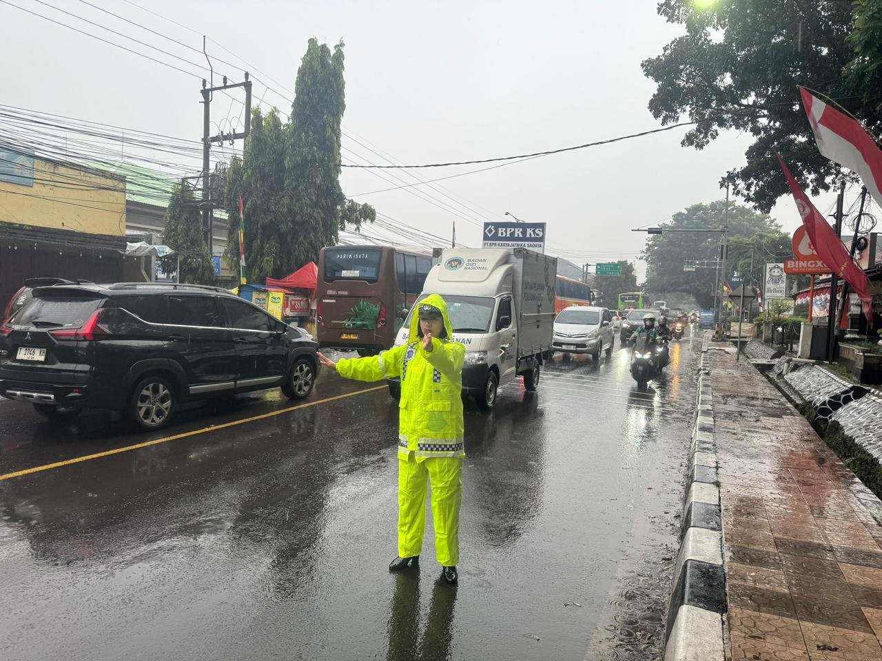 Lengkap dengan menggunakan jas hujan, Polisi cantik melakukan pengaturan arus lalulintas di simpang jalan, tempat-tempat yang rawan kemacetan, rawan lakalantas, pusat keramaian serta di depan Sekolah, Pada Selasa, 19 Agustus 2025.