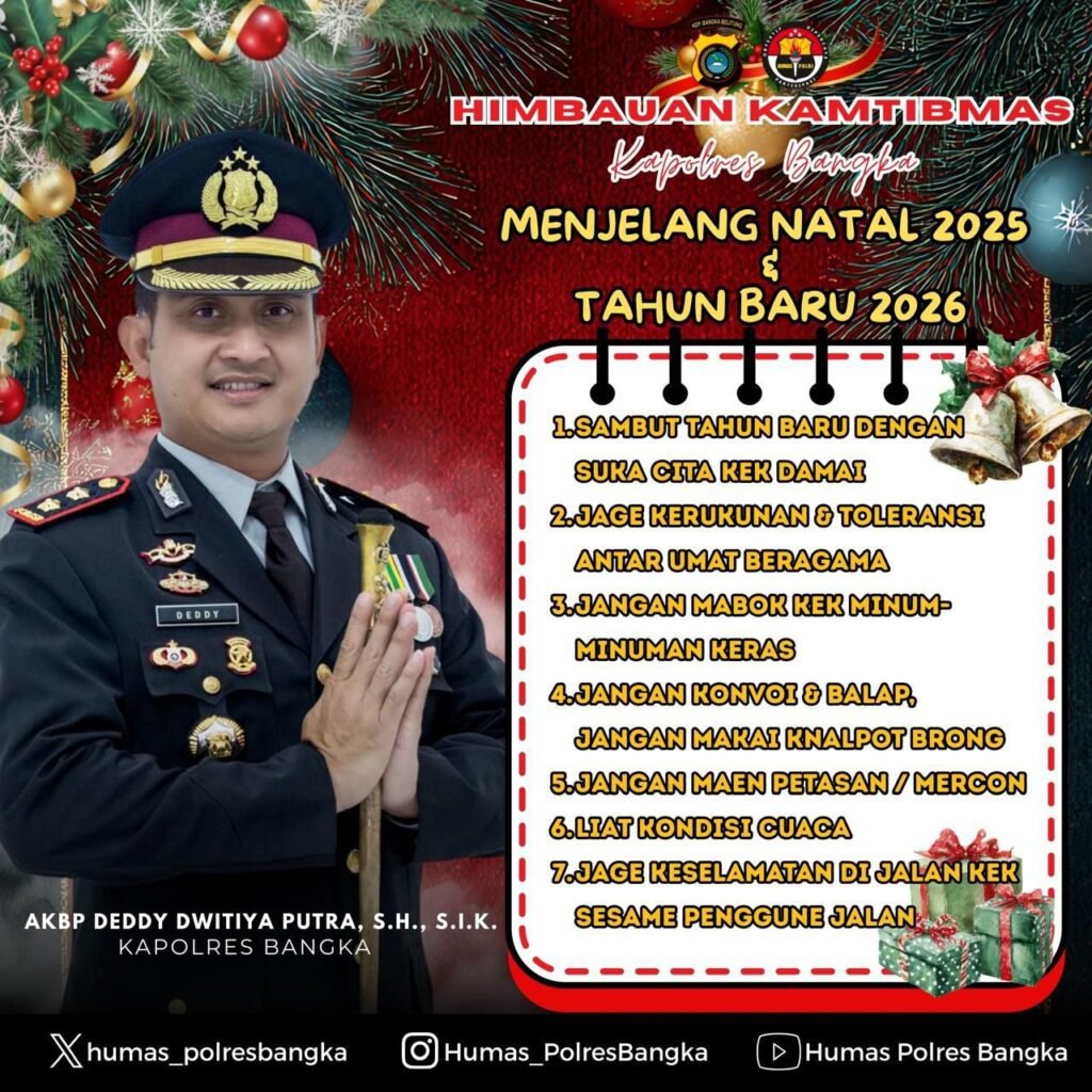 Global Rise TV (Bangka Sungailiat)- Menjelang perayaan Hari Raya Natal 2025, dan pergantian tahun Baru 2026, Kapolres Bangka AKBP Deddy Dwitiya Putra, S.H., S.I.K., mengimbau seluruh masyarakat Kabupaten Bangka, untuk Bersama-sama menjaga Situasi keamanan, dan ketertiban masyarakat (kamtibmas) agar tetap Aman, damai, dan kondusif, Sabtu (20/12/2025)