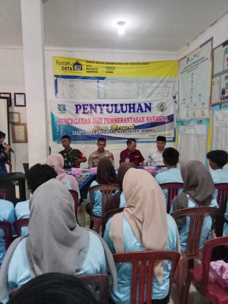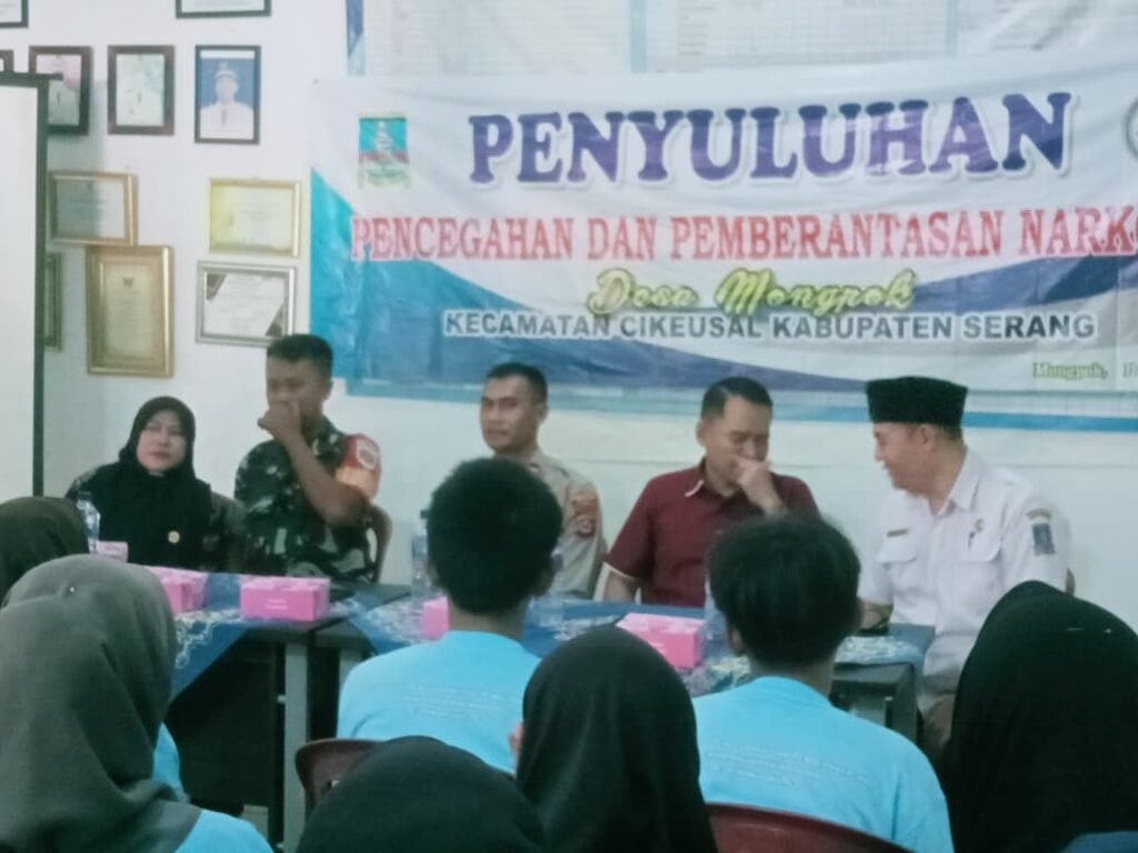 (Serang)- Kapolsek Cikeusal IPTU Hairus Saleh SH. Yang di dampingi. Kanit Samapta Aiptu Medi SH. dan Kanit Provos Aipda Arif. PR .Serta Bhabinkantibmas. Bripka Andri Maulana.,menghadiri Acara Penyuluhan, Pencegahan dan Pemberantasan Narkoba yang di selenggarakan di Aula Kantor Desa Mongpok Kec. Cikeusal Kab. Serang.