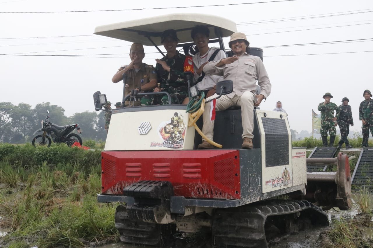 Dandim 0602/Serang, turun langsung melaksanakan pembajakan sawah menggunakan mesin modern, sebagai simbol dimulainya program ini didampingi Ketua Gapoktan Ratu Tani.