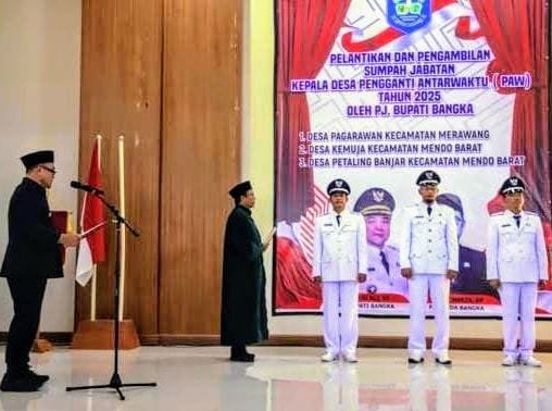 Global Rise TV (Bangka Sungailiat)- Pengambilan sumpah janji dan pelantikan kepala Desa terpilih desa pagarawan, Ahmad Zainudin, Desa kemuja Muhammad Solehan, dan Desa Petaling Banjar Abdul Mutolib, Periode 2025-2029 hasil pemilihan pergantian antar waktu (Paw) pelantikan dilakukan langsung oleh Pj. Bupati Bangka Jantani Ali, S.T., yang berlangsung di Gedung Pertemuan Graha Maras, Rabu (02/07/2025).