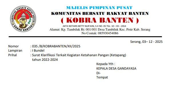 Lembaga Swadaya Masyarakat KOBRA Banten Layangkan Surat Kelarifikasi Kepada Pemerintahan Desa Gandayasa.