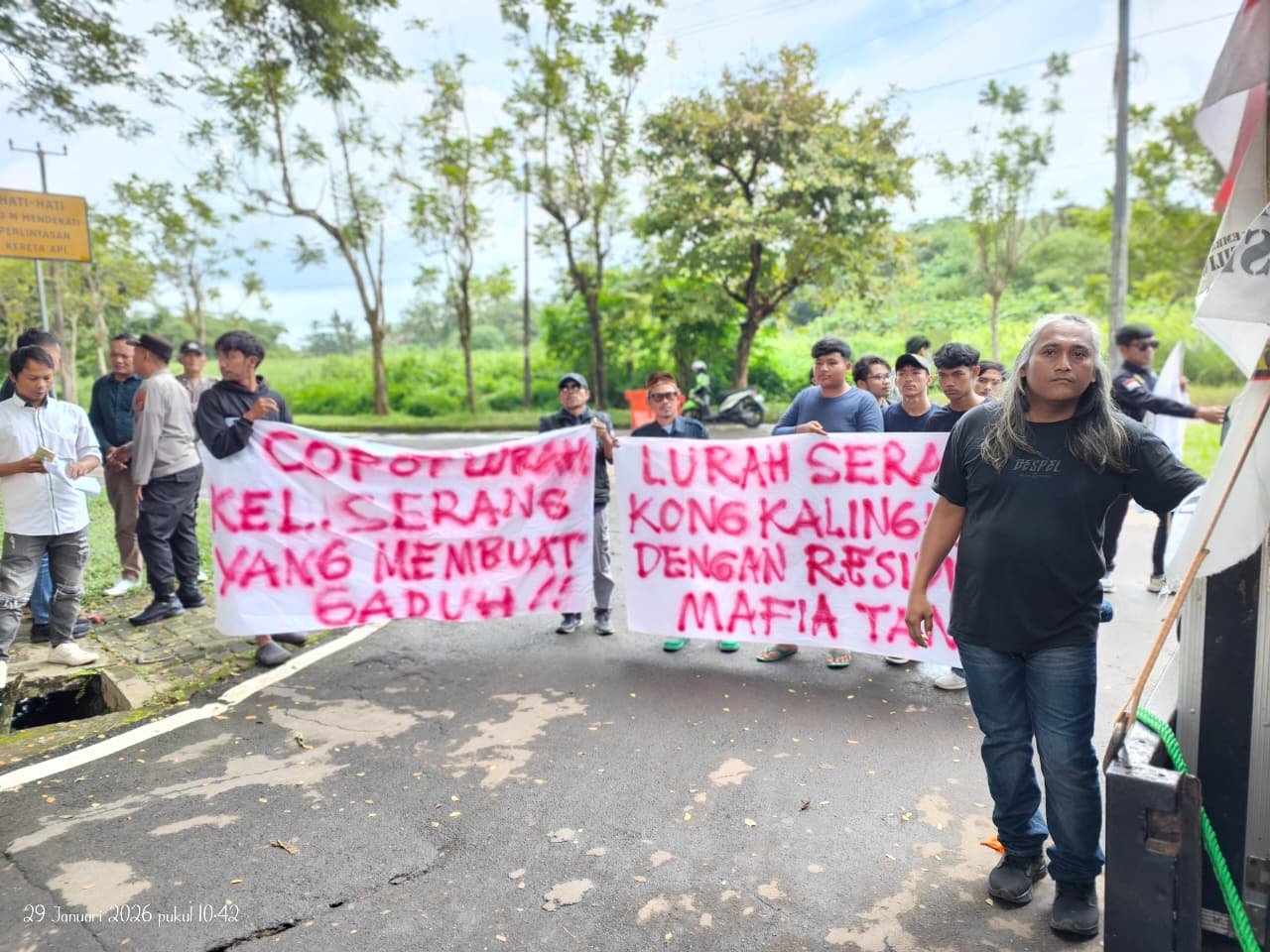 ”Kami hadir di sini untuk menyuarakan ketidakadilan. Ada indikasi kuat terjadinya mal administrasi dan Praktek Mafia Tanah dalam pengelolaan warkah pertanahan di Kelurahan Serang. Kami meminta Wali kota segera mengambil tindakan tegas dengan mencopot Lurah Serang dari jabatannya,” ujar Bung Beka