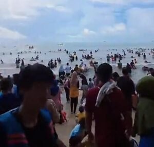 Global Rise TV,(Carita, Pandeglang Banten)– Momentum libur Hari Raya Idul Fitri dimanfaatkan masyarakat untuk berwisata, salah satunya dengan mengunjungi kawasan Pantai Carita. Sejumlah titik wisata pantai terlihat ramai dipadati pengunjung, baik wisatawan lokal maupun dari luar daerah. Senin, (23/3/26).