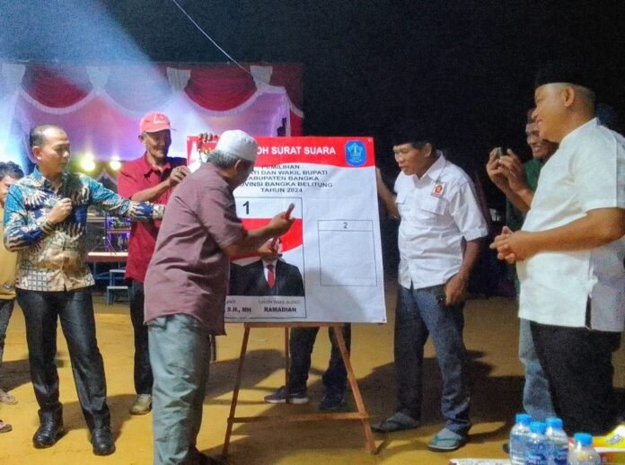 Global Rise TV (Bangka) Ketua PAC, kecamatan Mendo Barat, Bapak Hermanto, kita hadir di lapangan bola”, Sambutan Calon Bupati Bangka H. Mulkan, S.H.M.H., yang ada di desa Balunijuk dalam rangka malam kampanye dialogis selaku calon Bupati dan wakil Bupati Bangka periode 2024-2029, Gan lapangan Bola Bulunijuk Kecamatan Merawang, Kabupaten Bangka, Selasa Malam, Rabu (06/11/2024).