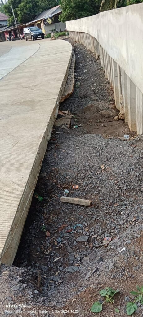 Global Rise TV (Serang-Banten)Dalam pengerjaan Penanganan Longsor Ruas Jalan Palima-Cinangka dengan No kontrak:000.2.3.1/060/SPK/PLJ-PC/BBM/DPUPR/IV/2024.Biaya pelaksanaan Rp.6.798.715.000.-00 Sumber pembiayaan APBD Provinsi Banten T.A.2024.Dan penyedia jasa Cv.Masa Agung Jaya Dengan konsultan pengawas.Pt.Karya Pratama Konsulindo yang diduga kuat dalam pengerjaan ASJAD alias asal jadi Karena diduga kuat tidak sesuai spek hal tersebut sangat terlihat jelas saat di lokasi pekerjaan terlihat tebing penahan longsor sudah ada yang retak atau patah disinyalir Cor beton menggantung diduga kuat dalam agregatnya tidak sesuai spek dan RAB dan disinyalir jalan Cor tersebut tidak akan bertahan lama karena kualitas dan kuantitasnya diragukan.Dan Jalan cor tersebut disinyalir jelas terlihat amblas.lalu seperti apa konstruksi nya kenapa pihak dinas terkesan tutup mata.
