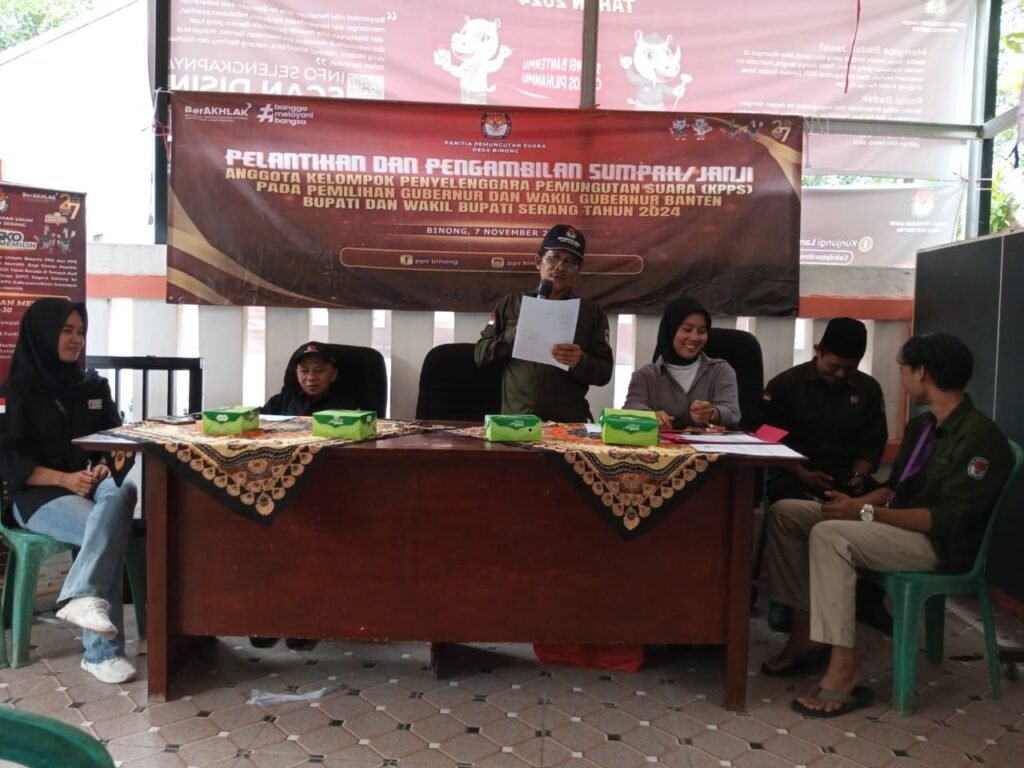 Diketahui pelaksanan pelantikan di aula kantor Desa binong Kec. Pamaryan pada Jam l 13 :00 Wib. yang di hadiri Oleh Seluruh Anggota KPPS Se Desa Binong mereka pun berjanji akan terus menjalankan rangkaian pilkada 2024.
