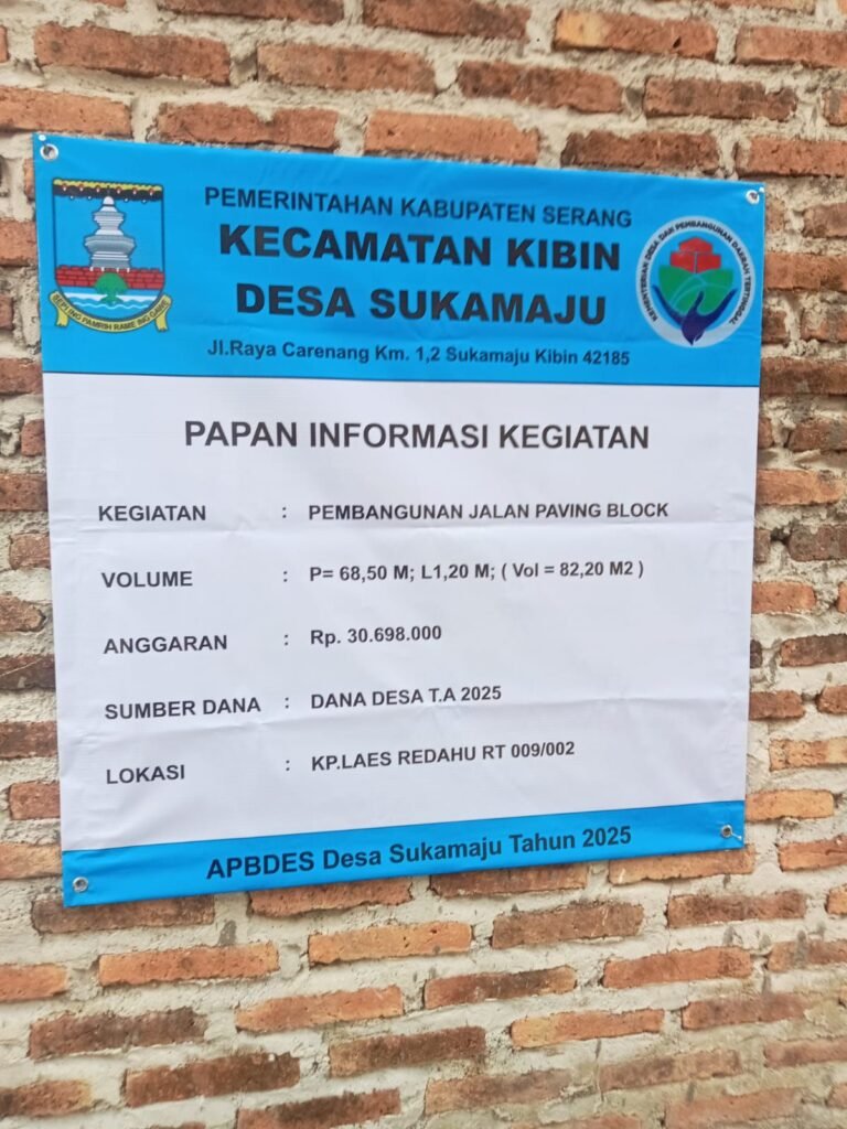 Global Rise TV (Serang)– Pemerintah Desa Sukamaju, Kecamatan Kibin, Kabupaten Serang, melaksanakan pembangunan jalan lingkungan di Kampung Laes Redahu RT 09 RW 02. Pekerjaan ini menggunakan paving block volume total=(82,20 M2) Kegiatan tersebut dibiayai melalui Dana Desa (DDS) Tahun Anggaran 2025 sebesar Rp.30,698,000 Selasa, (25/11/25).