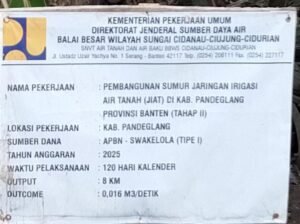 Global Rise TV (Pandeglang, Banten)-Pembangunan Jaringan Irigasi Air Tanah (JIAT) di Desa Ciherang, Kecamatan Picung, Kabupaten Pandeglang, yang dikelola oleh Kementerian Pekerjaan Umum Direktorat Sumber Daya Air Balai Besar Wilayah Sungai Cidanau, Ciujung, Cidurian, dirasa kurang transparan oleh masyarakat. Proyek yang dilaksanakan secara swakelola tipe 1 ini bahkan tidak menampilkan nominal anggaran di papan informasi yang harusnya tersedia untuk publik, Rabu : 24 Desember 2025.
