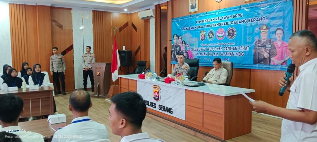 Global Rise TV (SERANG)-Polres Serang menggelar kegiatan pembekalan bagi 51 relawan Satuan Pelayanan Pemenuhan Gizi (SPPG) yang akan bertugas pada dapur Makan Bargizi Gratis (MBG) Polres Serang di Desa Cembeh, Kecamatan Ciruas, Kabupaten Serang. Kegiatan berlangsung di Aula Mapolres Serang, Senin (20/10/2025).