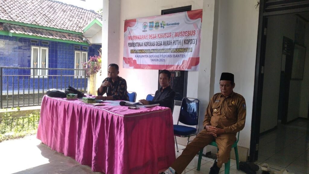 Musyawarah Desa Khusus (MUSDESUS) Pembentukan pengurus Koperasi Desa merah putih digelar di aula Desa Panunggulan. Acara ini dihadiri, Kepala Desa Dulhani. Cari staf. Ketua BPD Panunggulan, Ketua kader RT/RW.Sekmat Nahril Ulum, staf kecamatan Uci Sanusi, dan yang lainya. Acara musyawarah Desa merah putih ini di aula kantor Desa Panunggulan kec,Tunjung Teja Kab.Serang, 27/5/2025