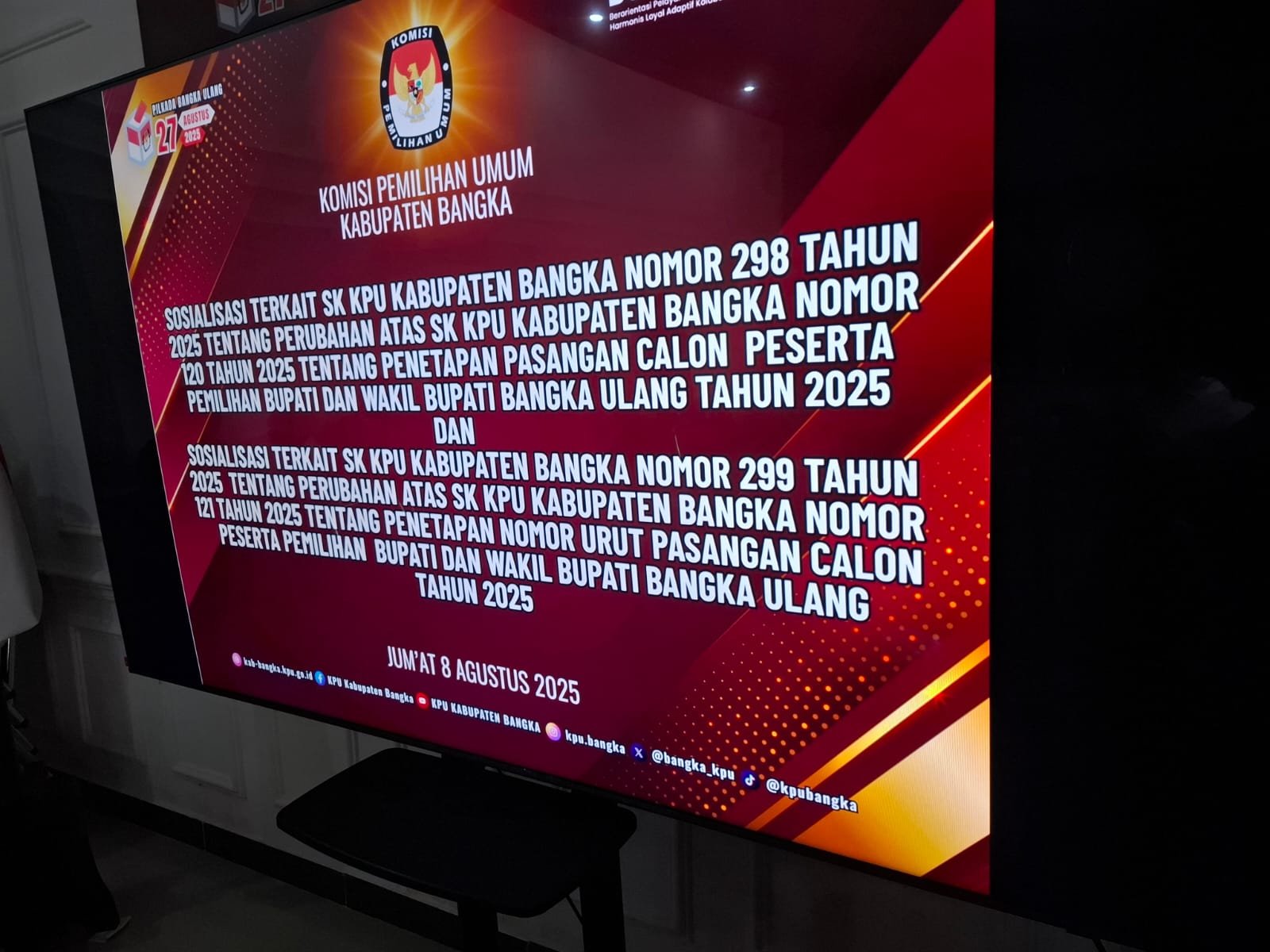 Global Rise TV (Bangka Sungailiat)-KPU Kabupaten Bangka menyampaikan Sosialisasi terkait keputusan KPU, nomor (298) tahun 2025. tentang perubahan SK-KPU nomor (120) tahun 2025, tentang penetapan pasangan calon pemilihan Bupati dan wakil Bupati ulang tahun 2025, dan satu lagi sosialisasi terkait SK- KPU Kabupaten Bangka, nomor (299) tahun 2025 tentang perubahan atas SK-KPU Kabupaten Bangka nomor (121) tahun 2025 tentang penetapan nomor, urut pasangan Calon Bupati dan wakil Bupati Bangka ulang tahun 2025, Bertempat di kantor KPU Kabupaten Bangka Jum.at (08/08/2025),
