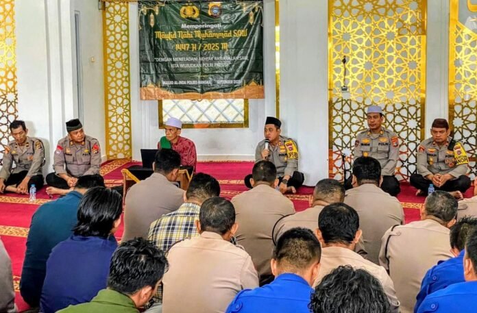 Global Rise TV (Bangka Sungailiat)- Polres Bangka, menggelar peringatan Maulid Nabi Besar Muhammad SAW, 1447 H/2025 M. Bertempat di Masjid Al, Inda Polres Bangka, Mengangkat tema dengan meneladani akhlak Rasulullah SAW, Wujudkan Polri. Presisi dalam upaya Mendukung asta cita, hadir dalam peringatan Maulid Nabi yakni Kapolres Bangka, AKBP Deddy Dwitiya Putra, dan Pejabat utama personel Polres Bangka, serta (ASN) yang, Beragama Islam Kamis (04/09/2025)