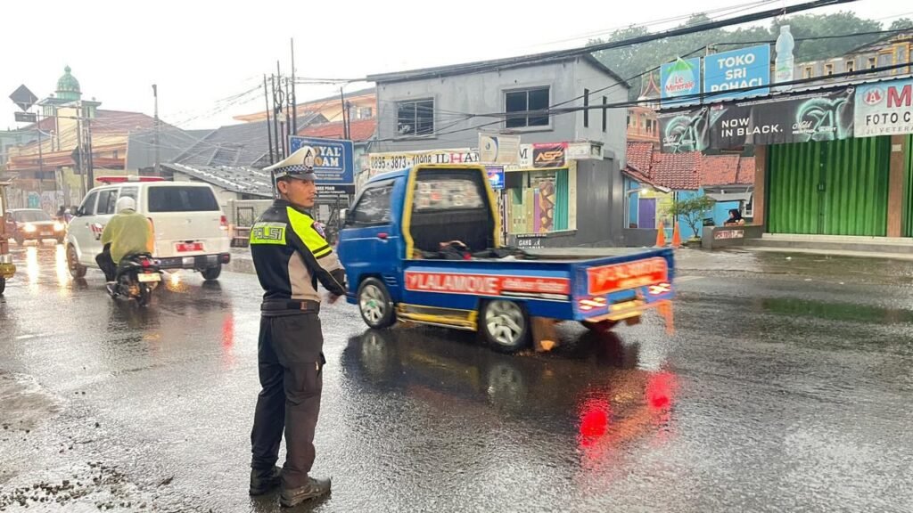 Dengan sigap, petugas melakukan pengaturan lalu lintas agar kendaraan tetap dapat melintas dengan aman selama proses evakuasi berlangsung.